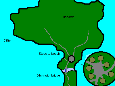 A promontory fort, of sorts. A great ditch, faced with stone, topped with a palisade and crossed by a fairly narrow bridge separates a low headland from the mainland. An open village of round-houses sits just inside the ditch. The area closest to the village is crop farmed, but the outlying fields are used as cattle pasture. There is a small sheltered beach, which is approached down a flight of steps, which is used to beach small curraghs used by local fishermen. Low cliffs surround the rest of the headland.
